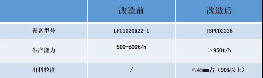1、原破碎設備為LPC1020R22-1錘式破碎機,配置功率為900KW,生產(chǎn)能力500-600t/h,計劃提產(chǎn)至950t/h以上(現場(chǎng)工況含土量較大,產(chǎn)量受限)。2、并對原破碎設備基礎進(jìn)行部分改動(dòng),設備更換為我公司JSPCD2226新型單段重錘反擊破,配置功率為1250KW。3、技改時(shí)間<15天,經(jīng)改造后破碎系統生產(chǎn)能力>950t/h,出料粒度≤45mm占90%以上。4、噸電耗由1.8度,降低至1.3度,噸電耗降低27%。