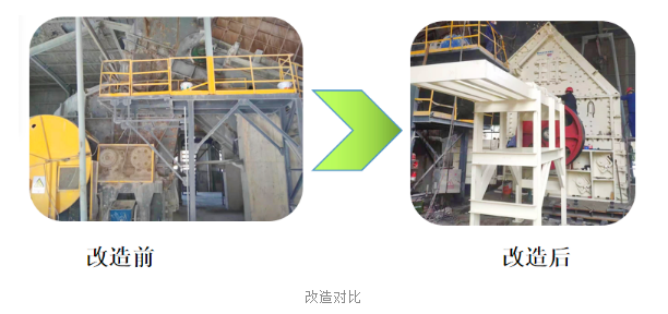 2、板喂機給料角度由23度降低至17.5度,頭部鏈輪給料高度降低900mm,另電機型號由45kW增大至55kW。3、破碎設備在不改變原有破碎設備基礎的情況下,拆除原PCD2022單段破碎機,更換為我公司JSPCD2226新型單段重錘反擊破。4、技改時(shí)間<10天,改造后生產(chǎn)能力達到1200t/h,出料粒度≤50mm占90%。5、噸電耗由1.3度,降低至0.67度,噸電耗降低48%。