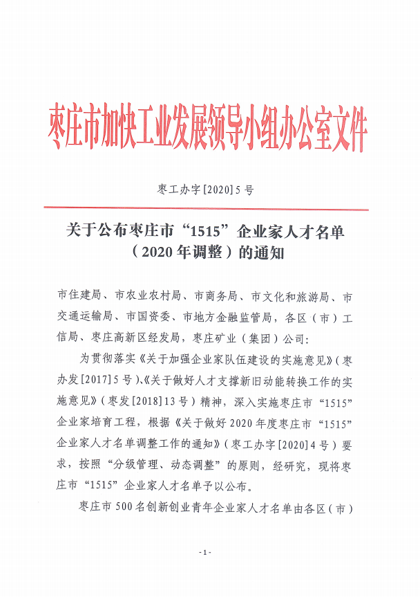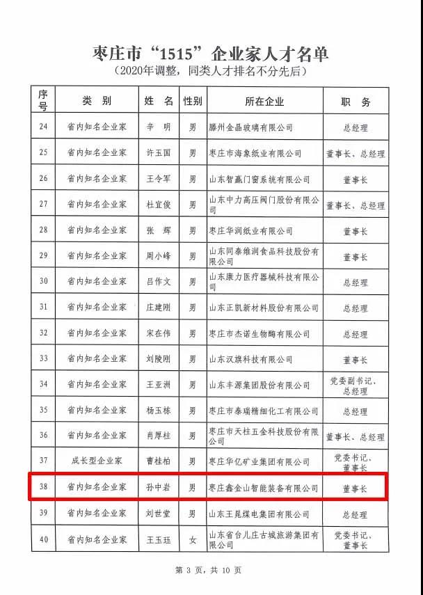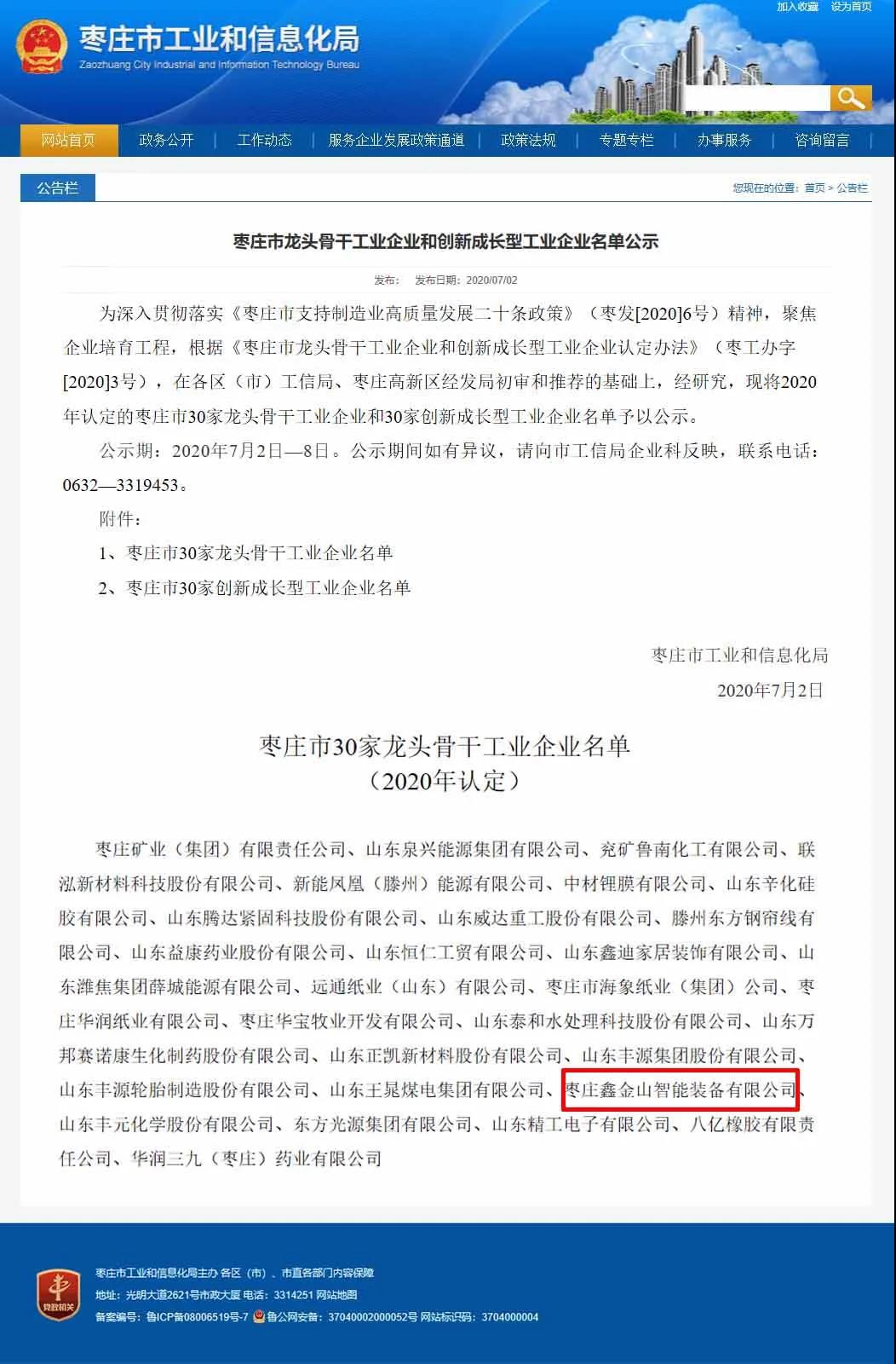 導讀:近日,從棗莊市工業(yè)和信息化局傳來(lái)喜訊,正式公示了2020年棗莊市龍頭骨干工業(yè)企業(yè)和創(chuàng )新成長(cháng)型工業(yè)企業(yè)名單以及棗莊市“1515”企業(yè)家人才名單,棗莊鑫金山智能裝備有限公司榜上有名,成功榮獲“棗莊市龍頭骨干企業(yè)”殊榮,董事長(cháng)孫中巖榮獲棗莊市“1515”企業(yè)家榮譽(yù)稱(chēng)號。
