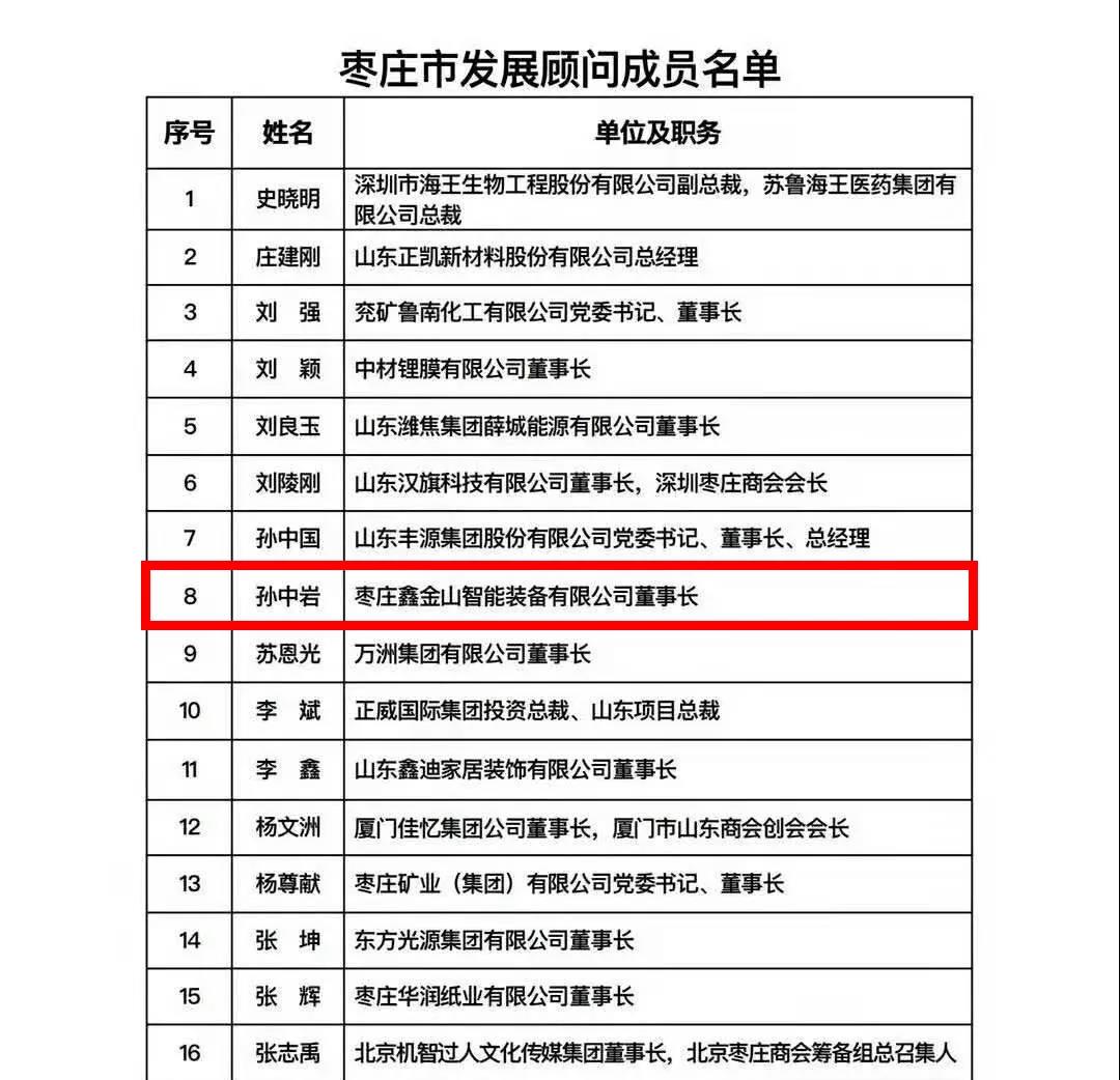 為進一步聚焦聚力“先把棗莊經(jīng)濟搞上去”,開創(chuàng)棗莊市創(chuàng)新轉型高質量發(fā)展新局面,發(fā)揮企業(yè)家在經(jīng)濟社會發(fā)展中的重要作用。棗莊市從重點產(chǎn)業(yè)骨干、外來投資商、異地棗莊籍企業(yè)家代表中選聘26名棗莊市發(fā)展顧問。其中,棗莊鑫金山智能裝備有限公司董事長孫中巖位列其中,被聘為“棗莊市發(fā)展顧問”。