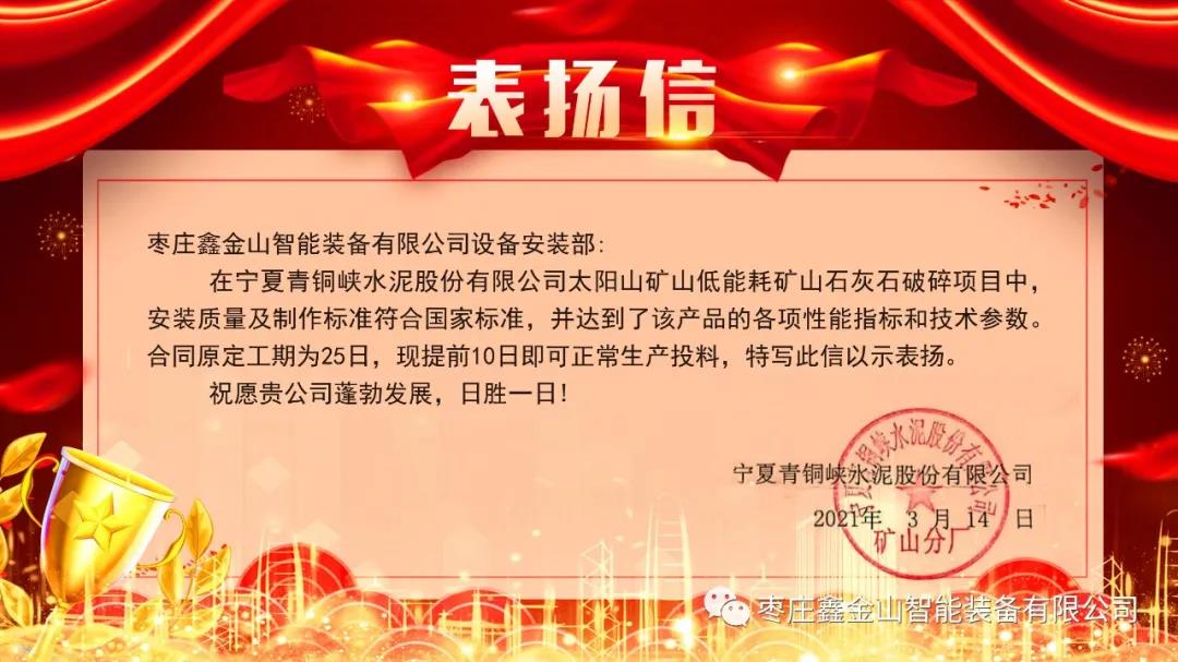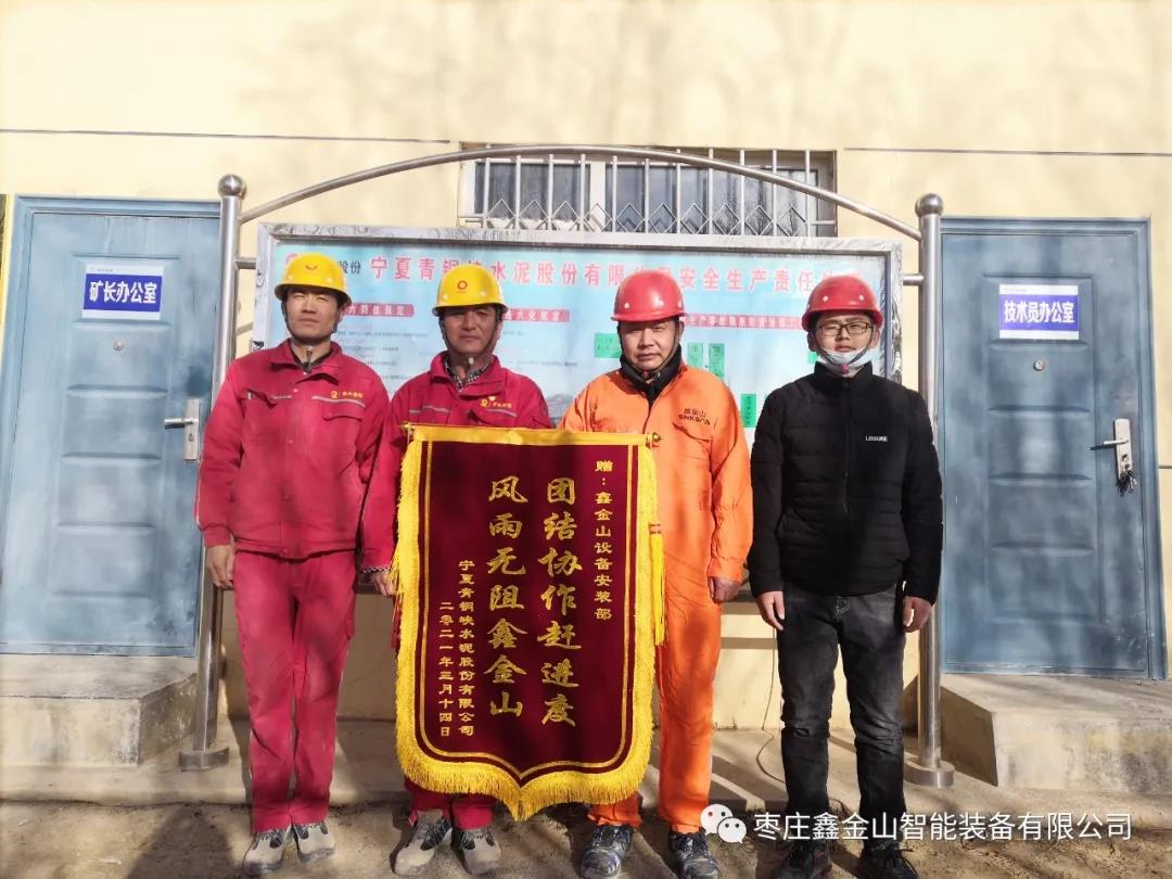 近日,鑫金山公司收到來(lái)自寧夏青銅峽水泥股份有限公司贈(zèng)送的“團(tuán)結(jié)協(xié)作趕進(jìn)度,風(fēng)雨無(wú)阻鑫金山”的錦旗與表?yè)P(yáng)信。感謝鑫金山公司設(shè)備安裝部在寧夏青銅峽水泥太陽(yáng)山礦山低能耗礦山石灰石破碎項(xiàng)目中提供的優(yōu)質(zhì)服務(wù),并對(duì)團(tuán)隊(duì)加班加點(diǎn)、保質(zhì)保量提前完成施工任務(wù)的工匠精神給予了高度評(píng)價(jià)。再次充分彰顯了客戶(hù)對(duì)鑫金山公司優(yōu)質(zhì)高效服務(wù)的信任與認(rèn)可。