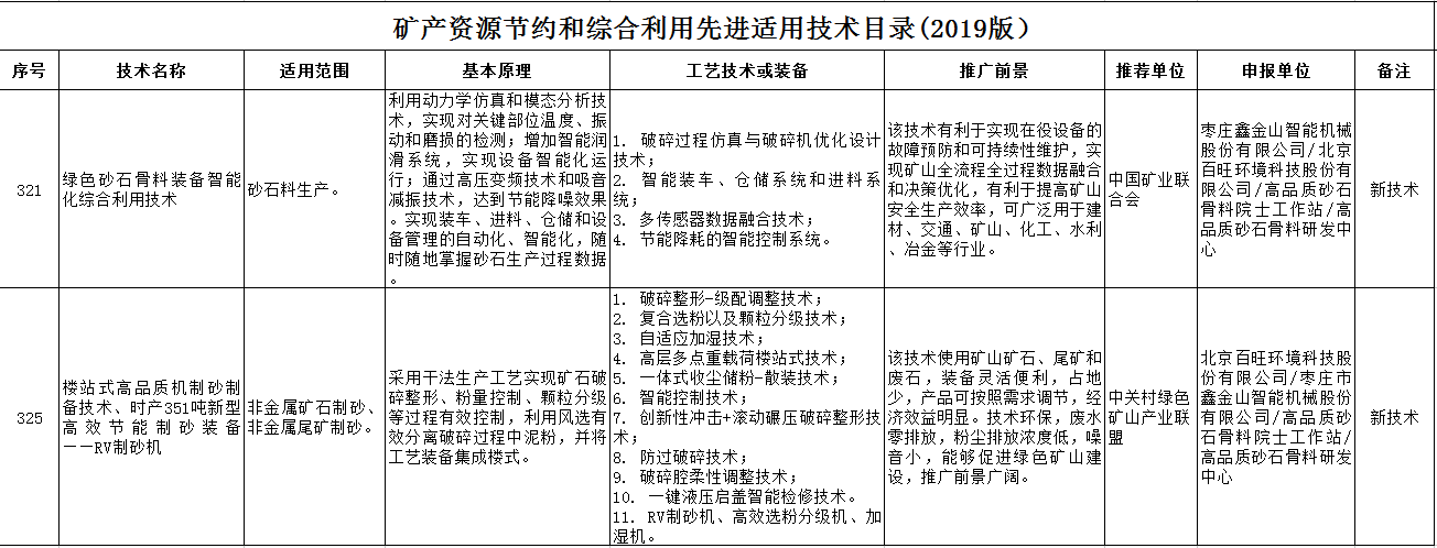 導讀:2019年12月,國家自然資源部辦公廳發(fā)布了關(guān)于《礦產(chǎn)資源節約和綜合利用先進(jìn)適用技術(shù)目錄(2019版)》的公示,棗莊鑫金山智能機械股份有限公司的樓站式高品質(zhì)機制砂制備技術(shù)、時(shí)產(chǎn)351噸新型高效節能制砂裝備——RV制砂機和綠色砂石骨料裝備智能化綜合利用技術(shù)作為新技術(shù)成功入選,這兩項先進(jìn)適用技術(shù)分別由中關(guān)村綠色礦山產(chǎn)業(yè)聯(lián)盟和中國礦業(yè)聯(lián)合會(huì )推薦。